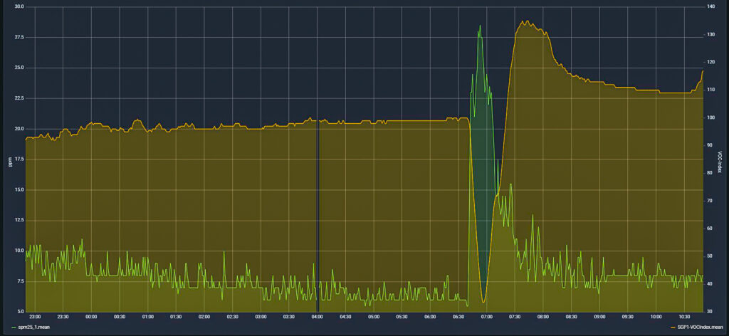 Die Feinstaubkonzentration in einem Raum steigt relativ rasch an, wenn man die Fenster öffnet und querlüftet. Der Staub im Zimmer wird dabei aufgewirbelt. Die Abbildung links zeigt den Verlauf der gemessenen TVOC (flüchtige organische Komponenten) in der Luft, gemessen mit einem SGP40 von Sensirion) und der Feinstaub-Konzentration (PM2.5, gemessen mit dem Vindriktning). Die TVOC-Konzentration (gelbe Kurve) als Maß für die Raumluftqualität sinkt rasch ab, und die Feinstaubkonzentration (grüne Linie) steigt gleichzeitig abrupt an.