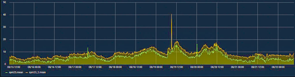 Im nebenstehenden Bild werden die Feinstaub (PM2.5)-Messkurven von zwei ‘gehackten’ IKEA-Feinstaubsensoren (Vindriktning) (gelbe und grüne Linie) mit der Messkurve eines Sensirion SPS30 (rote Linie) verglichen Man sieht, dass bis auf einige ‘Ausreißer’ der Ikea-Feinstaubsensoren die Kurven relativ parallel verlaufen. Die günstigen IKEA-Feinstaubsensoren geben die Feinstaubkonzentration offensichtlich relativ gut wieder. Die oben erwähnten Aussage in einem Forum kann also in der eigenen Erfahrung nicht bestätigt werden.