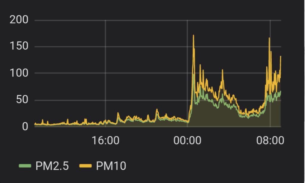 Der SPS30_Sensor kann die Konzentration der Partikelgrößen PM1 bis PM 10 µm separat messen, also PM1.0, PM2.5, PM4.0 und PM10.0. In der Praxis zeigt sich aber, dass zumindest der Feinstaub im Innenraum in der Regel eine Größe ≤1 µm hat. Die Einzelkurven der verschiedenen Partikelgröße überlagern sich somit in der Kurvendarstellung (Grafana). Die höhere Auflösung der Messung bringt offensichtlich wenig. Beunruhigend ist aber dass der Feinstaub in der häuslichen Raumluft eine Größe ≤1 µm aufweist.