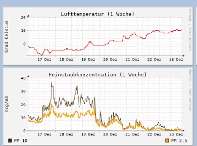 Das nebenstehende Diagramm zeigt den Zusammenhang zwischen Außentemperatur (oben) und der Feinstaubkonzentration in der Luft (unten). Die Feinstaubkonzentartion mit der Partikelgröße 10 µm (PM) ist in der schwarz gefärbten Kurve, die der Partikelgröße PM 2,5 (2,5 µm) in der ockerfarbenen dargestellt. Besonders ausgeprägt war dies im dargestellten Dezember 2022, als der Gaspreis explodierte. Hauptquelle für diesen Anstieg der Feinstaubkonzentration in der Luft sind mit Holz befeuerte Öfen. “Kurzzeitige“ Anstiege für Feinstaub-Immissionen in den Wintermonaten sind laut gesetzlichen Vorgaben leider völlig legal, obwohl dies gesundheitlich enorm schädlich ist.