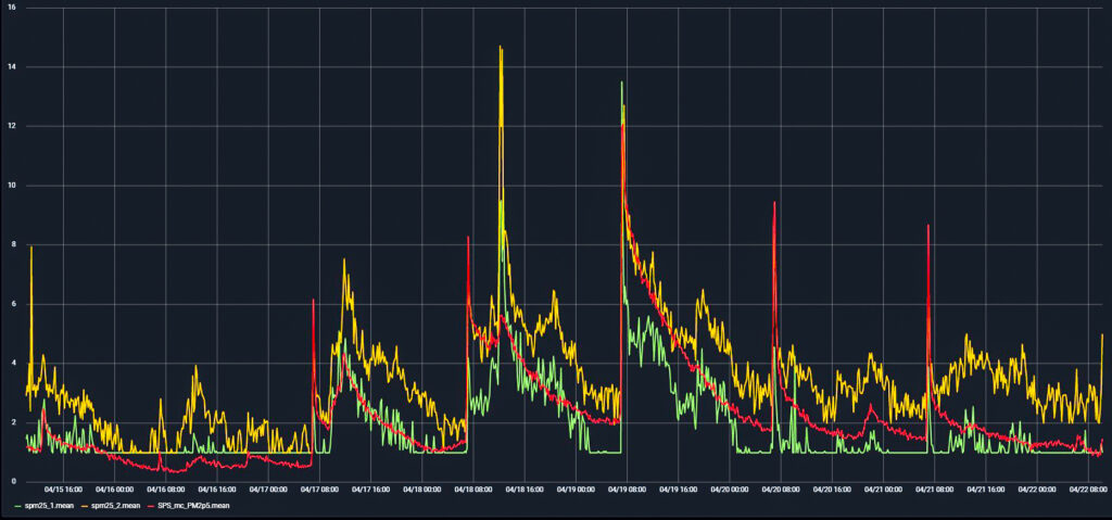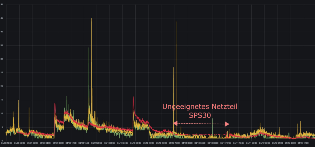 Linksstehend die Messkurven von zwei IKEA-Vindriktning-Feinstaubsensoren (gelbe und grüne Linie) und eines SPS30-Feinstaubsensors (rote Linie). Auffällig ist, dass der SPS30-Sensor Probleme mit nicht-optimierten Netzteilen hat (gekennzeichnet in der Grafik). In diesem Falle war es ein Mehrfach-Ladeteil für Elektronikgeräte (Ausgang 2,1 A). Bei Nutzung eines Netzteil für Raspberry Pi-Geräte gibt es dagegen in der eigenen Erfahrung keine Probleme.