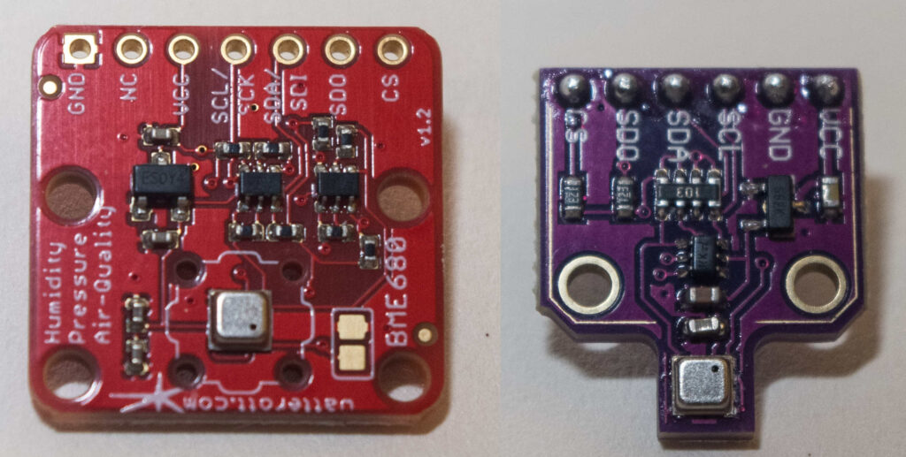 Der Sensor BME 680 der Fa. Bosch ist eine Weiterentwicklung des BME 280; der BME 680 kann zusätzlich die Luftgüte messen. Es gibt bei bosch-sensortech.com unter ‘Documents’ ein Datenblatt zum Download. Die hier angegebene Messgenauigkeiten: Feuchte ± 3% , Luftdruck ±0.12 hPa und Temperatur ±1.0 ° C . Der Luftgütesensor hat eine response time von 1 sec. Im nebenstehenden Bild ist ein Breakout-Board mit BME 680-Sensor der Fa. Watterott auf der linken Seite zu sehen, daneben ein China-Import. Die Preise schwanken zwischen knapp 1 Euro (aliexpress) und 25 Euro für ein Adafruit-Breakout-Board. Der Sensor selbst wird lt. Datenblatt mit 1,7 — 3,6 V Betriebsspannung betrieben. Die Breakout-Boards werden in der Regel mit 3,3 V betrieben und tragen einen Pegelwandler für 5 V‑Spannungen (bitte im Einzelfall im Datenblatt genau nachsehen!). Der BME 680 Sensor kann mit einem I²C ‑Datenbus ausgelesen werden. Die Adresse kann bei Benutzung von zwei BME 680 in einem I²C-Strang verschieden eingestellt werden. Voreingestellt ist (in den benutzten Sensor-Breakout-Boards) 0x77; durch Ziehen des Pins SD0 auf Masse kann die Adresse auf 0x76 geändert werden (bitte im Einzelfall Datenblatt konsultieren!). in der eigenen Anwendung verwendete Breakout-Boards von Adafruit und Watterott tragen Stemma QT-Steckverbinder (SparkFun Qwiic-kompatibel). Mit diesen Steckverbindern kann man das Breakout-Boards einfach verbinden, es ist kein Löten erforderlich. Der BME 680-Sensor kann auch mit SPI ausgelesen werden. Adafruit bietet für seine Breakout-Sensoren mit einem BME 680 hierzu eine Anleitung. Die SPI-Pin-Bezeichnungen sind auch bei dem Breakout von Watterott aufgedruckt. Die Preisunterschiede zwischen den Sensoren verschiedener Anbieter erklären sich wahrscheinlich durch diese Komfort-Features. Es wird empfohlen, den Sensor BME 680 beim ersten Mal 48 Stunden lang zu betreiben, um ihn “einzubrennen”. Später genügen dann 30 Minuten Aufwärmzeit vor de‑m Einsatz. Dies ist notwendig, weil sich die Empfindlichkeitsstufen des Sensors während der frühen Verwendung ändern und der Widerstand langsam ansteigt, wenn sich der MOX auf seinen Ausgangswert erwärmt.