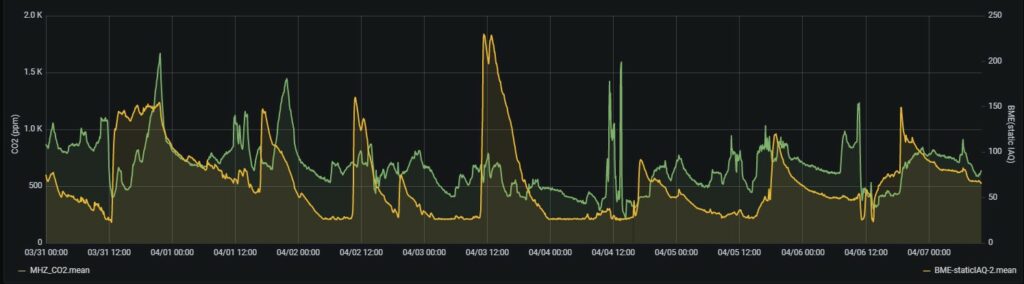 Vergleich CO2 versus IAQ: In der nebenstehenden Abbildung (aus Grafana) werden die Kurven der CO2-Messungen (MH-Z19, Skala auf der linke Y‑Achse, grüne Linie) und der Messwerte des static IAQ-Wertes eines BME 680 (Skala auf der rechten Y‑Achse, gelbe Linie) vergleichend dargestellt. Man sieht keine eindeutige Parallelität beider Kurven, es sind aber gleiche Tendenzen der Wertepaare erkennbar. Man hat den Eindruck, dass die static IAQ-Werteänderungen (gelbe Kurve) zeitlich etwas vor denen des CO2 (grüne Kurve) erfolgen.