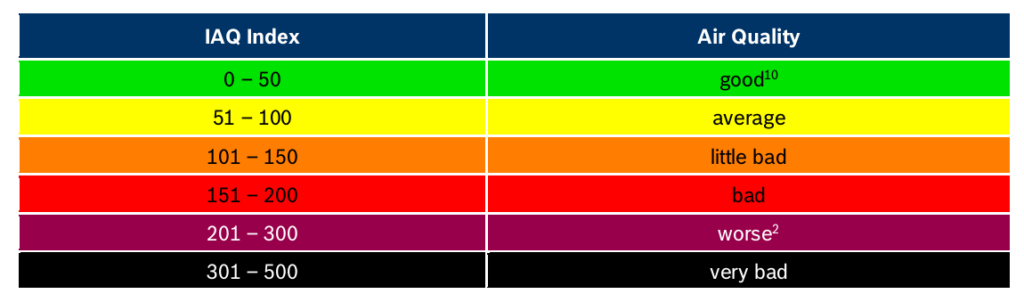 Die Wertung von IAQ und die daraus abgeleiteten Empfehlungen der Fa. Bosch (aus dem Datenblatt)
