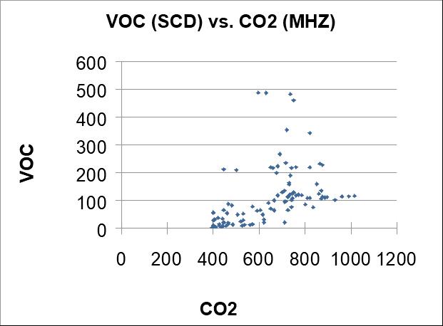 Korrelation Messwerte CO2 (MH-Z19) und VOC-Index (SGP40): Man sieht zwar eine gewisse Korrelation zwischen beiden Messergebnissen. Die Werte streuen aber doch sehr, insbesondere im Bereich mittlerer und höherer Messwerte.