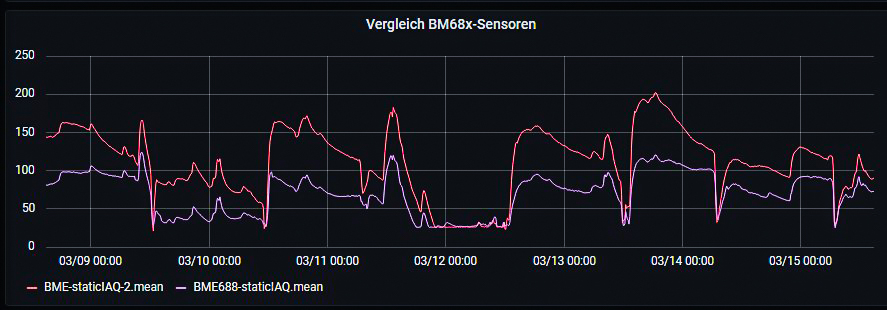 BME 688: Dieser aktuellste Sensor aus der BME 68x-Familie wird von Bosch folgendermaßen beworben: “.. Additionally to all features of the BME 680 the BME688 has a gas scanner function. In standard configuration, the presence of VSCs is being detected as indicator for e.g. bacteria growth…” VSCs sind flüchtige Schwefelverbindungen, die u. a. bei verdorbenen Lebensmitteln freigesetzt werden. In der nebenstehenden Abbildung (aus Grafana) werden die Messwerte beider Sensoren aus der BME 68x-Reihe verglichen. Die rote Linie in der Grafana-Grafik gibt die Messwerte (static IAQ) eines BME 680 wieder, die blass-lila hellere Kurve die eines BME 688. Auch hier sieht man parallel verlaufende Kurvenlinien, aber auch deutlich unterschiedlich hohe Werte. Der BME 688 gibt hier niedrigere static IAQ-Werte aus als der BME 680, ähnlich den Ergebnissen in der vorigen Abbildung.