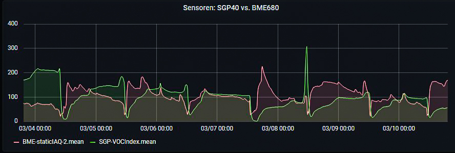 Fazit: Der BME 680 gibt viele Werte aus. Die Daten zur Luftgüte (IAQ) entstammen aber aus einem (nicht offengelegten) Algorithmus, der im Sensor implementiert ist. Die ausgegebenen IAQ-Werte variieren, wobei die Messwert-Tendenzen sehr ähnlich wiedergegeben werden.