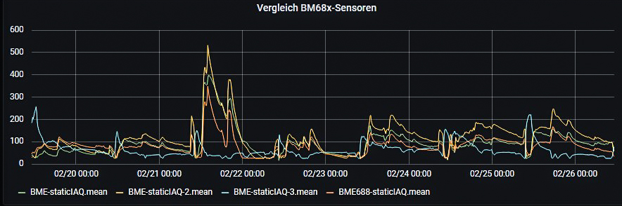 Vergleich verschiedener BME 68x-Sensoren: In der nebenstehenden Abbildung (aus Grafana) werden die static IAQ-Werte verschiedener BME 68x verglichen. Neben BME 680-Sensoren ist auch einer vom Typ 688 (rote Kurvenlinie) vertreten. Als erstes fällt auf, dass ein BME 680-Sensor (blaue Linie) offensichtlich ganz andere Werte als die anderen Sensoren wiedergibt. Er scheint defekt zu sein. Die anderen Sensoren ergeben zwar parallel verlaufende Kurvenlinien, aber auch deutlich unterschiedlich hohe Werte.