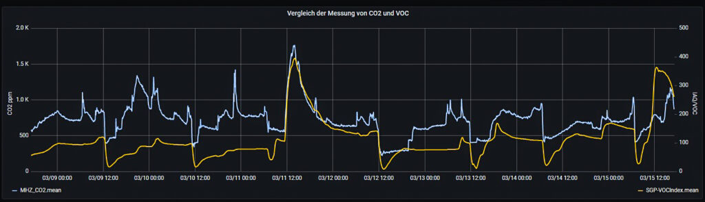Vergleich CO2 (MH-Z19) und VOC-Index: Im nebenstehenden Bild sieht man die Messkurven von CO2 (blaue Linie) und VOC-Index (gelbe Linie, Skala auf der rechten Y‑Achse) . Die Kurven laufen relativ parallel. Bei Querlüftung des Zimmers fallen die Werte ab, danach steigen sie wieder an.